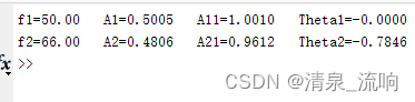 其中f1和f2表示两信号的频率,A1和A2表示两信号修正前的幅值,A11和A21表示两信号修正后的幅值,Theta1和Theta2表示两信号的初始相位角。而第1个信号的幅值和初始相角非常接近