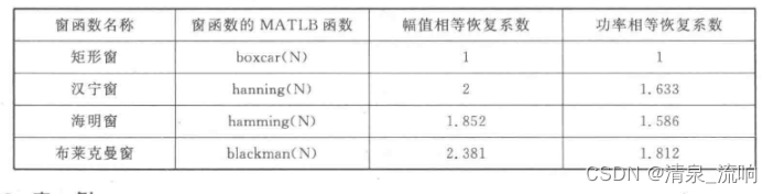 下面把一些主要窗函数的幅值恢复系数列,在下表中,表内MATLAB函数中的N是窗函数的长度。
