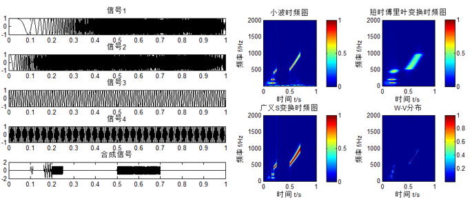 左图最下面为合成信号,右图为四种变换对合成信号进行的时频分析。