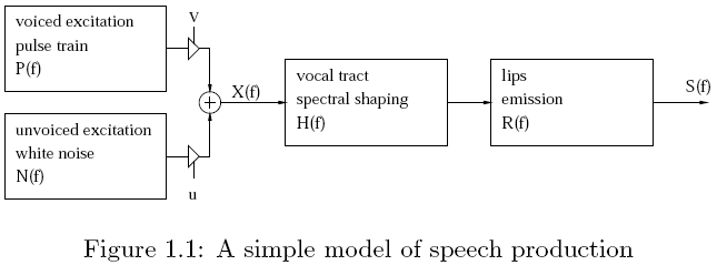 共振峰参数包括共振峰频率和频带的宽度,它是区别不同韵母的重要参数,由于共振峰包含在语音的频谱包络中,因此共振峰参数的提取关键是估计自然语音的频谱包络,并认为谱包括的极大值就是共振峰,通常认为共振峰数量不超过4个。发声模型:
