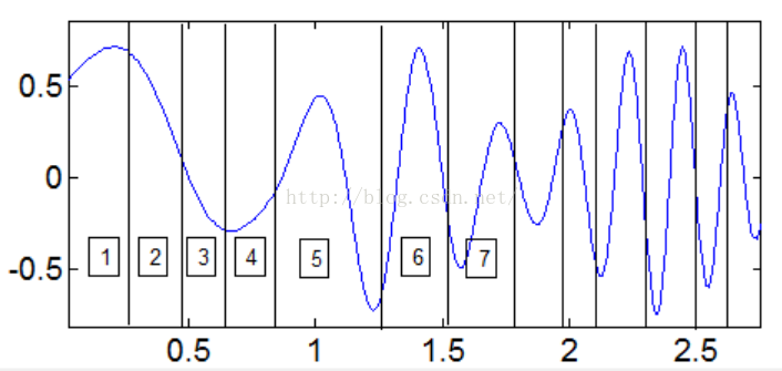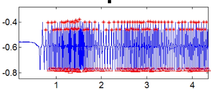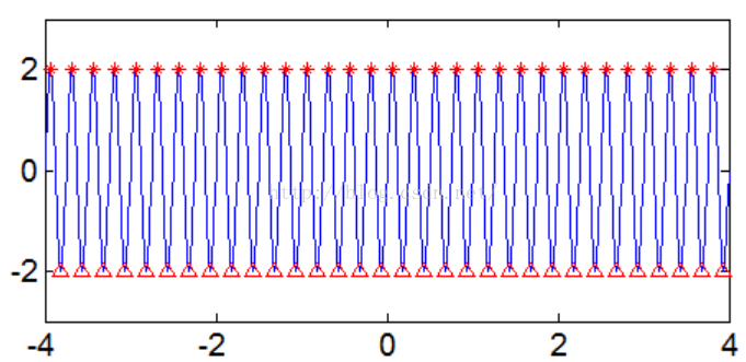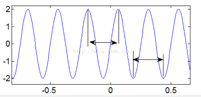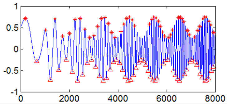 当然根据信号在时域中的特征,我们可以知道,信号的一个周期就是相邻极大值到极大值(极小值到极限值)的区间。如下图3,分析图中曲线的特点,一个信号的周期检测只需要探测到相邻两个极大值(极限值)就能确定信号的周期,所以,这个问题可以表达为检测信号的极大值和极限值问题。当然极值点检测在Matlab中可以有max和min函数实现。找到极值点就能确定信号的周期,这也是经验模态分解(EMD)方法在对信号进行筛分的过程中也对信号极值进行检测的原因。