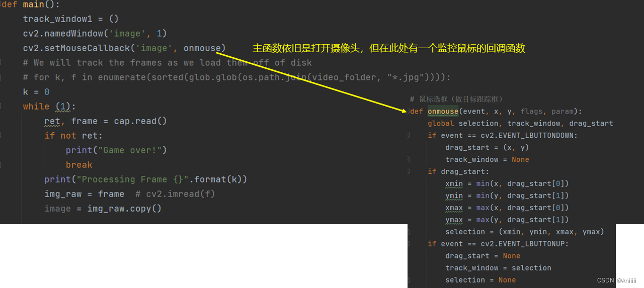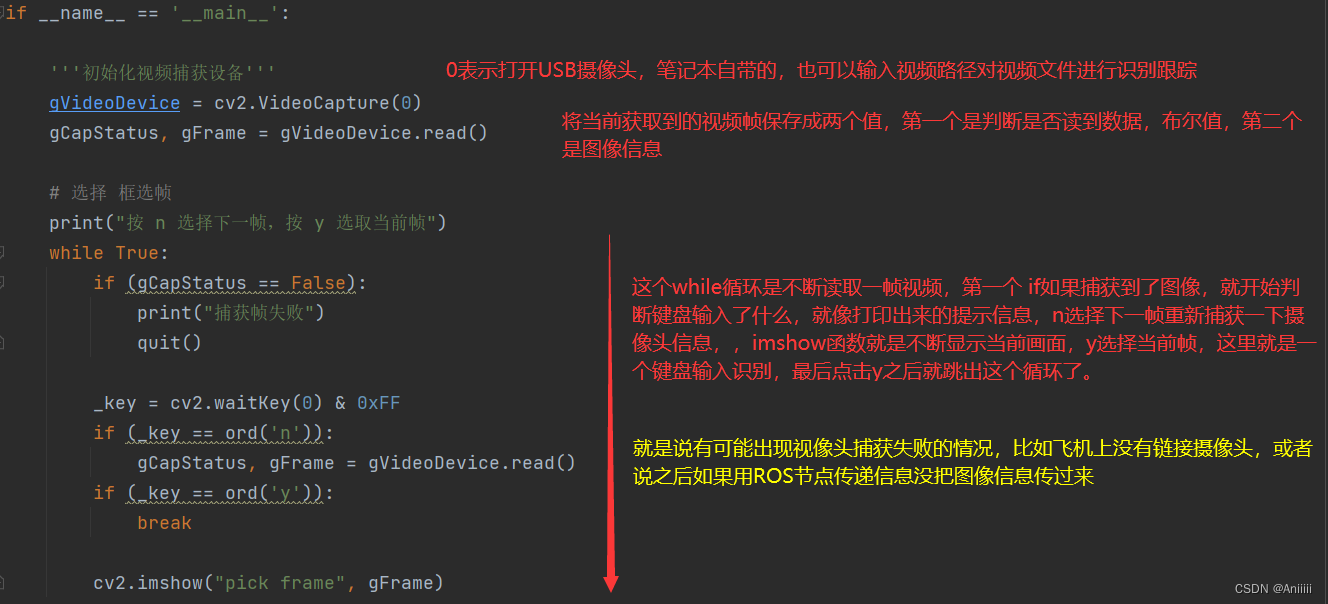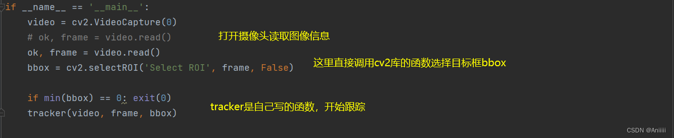 4.第四个代码说一下动态框选 ,由于上述手撸的DSST程序,有个小小的缺点,就是他会在相机打开的那一瞬间的一帧中让你选择需要跟踪的目标进行框选,所以在无人机上的应用就会很麻烦,最好是画面一直在动, **等目标何时出现了,我再进行框选。** 这个想法我目前认为可以跟YOLO算法结合一下,让YOLO也有可选择性,也挺好的。下面讲一下这个代码我怎么改的,也是跟网上的大佬写的代码拼接...需要运行的是run2.py