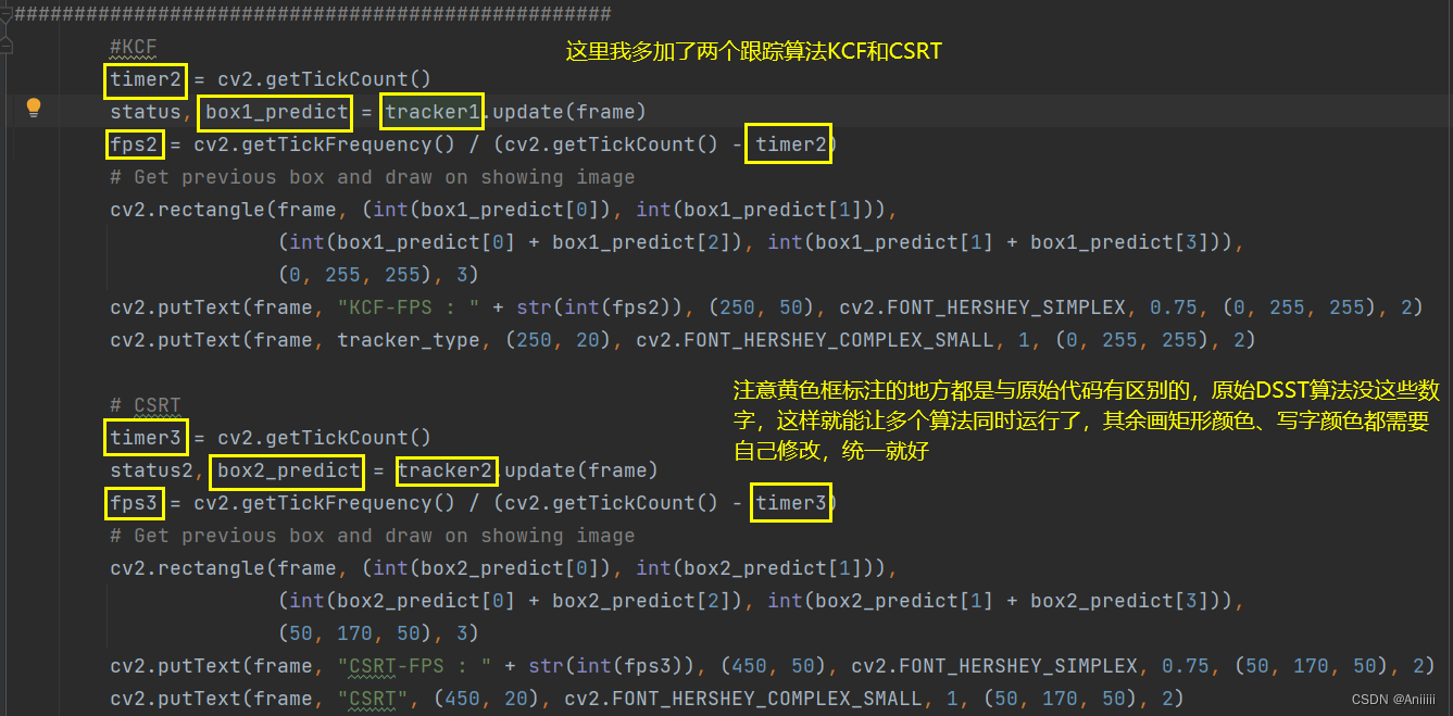 5.第五个代码说一下如何初始化多个跟踪器,进行性能对比 ,这部分代码仍然是在上一个代码的基础上加以修改得到的,我们的目标即,通过一个同矩形进行初始化,保证每个算法得到的初始信息是相同的,进而对比各种算法性能优劣,需要运行的是run3.py,简略介绍如下: