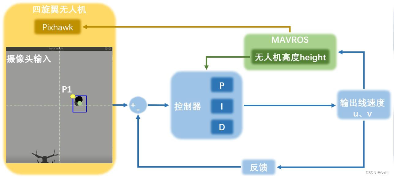 然后运行控制程序,根据目标框中心的坐标与整个摄像头屏幕中心的偏离程度来进行控制,PID控制,输出无人机的速度信息,封装成MAVROS信息,发送给飞控板