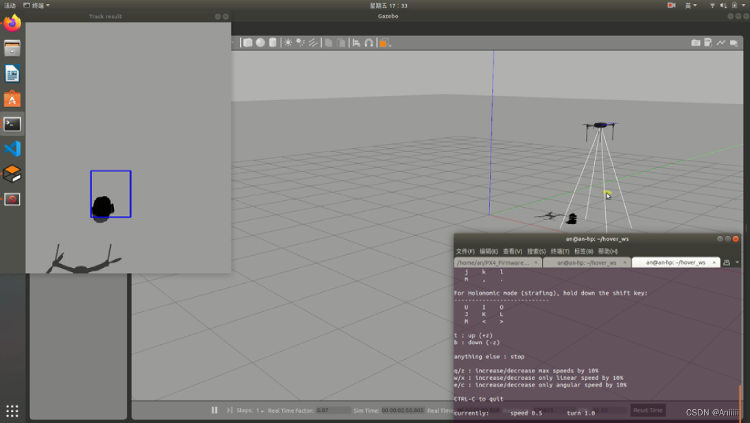 在这一块还有一个毕设中的小思考,因为在实物验证中,师兄帮忙飞四旋翼,每次飞行的高度肯定是不一样的,那么伴随着跟踪框在争个画面中的移动速度是不一样的,它反应速度也会不同,离得太近的时候过于灵敏,离得太远的时候反应很慢,跟不上,所以师兄的建议就是把高度信息引入控制回路中,这个高度信息是PX4就可以获取的,这个我也在仿真中跑通并在实物上运行成果了。