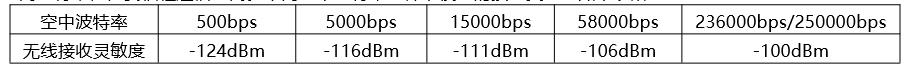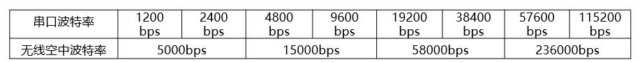 为了使通信距离尽量远,可以把串口波特率设为低波特率。如果是短时间传送大量数据,则把串口波特率设为 高波特率,但要牺牲通信距离。不同空中波特率条件下模块的接收灵敏度如下表所示: