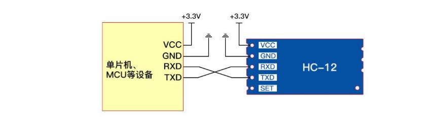 注: 如上面图所示,HC-12 模块用于代替半双工通信时的物理连线。左边的设备向模块发送串口数据,模块的 RXD 端 口收到串口数据后,自动将数据以无线电波的方式发送到空中。右边的模块能自动接收到,并从 TXD 还原最初左 边设备所发的串口数据。从右到左也是一样的。模块间只能工作于半双工状态,不能同时收发数据。