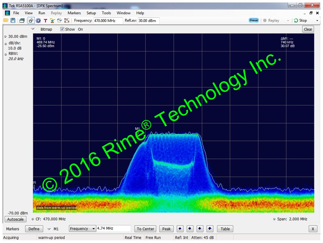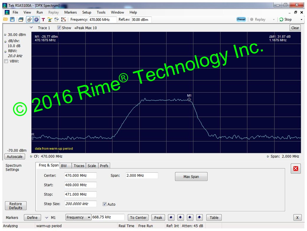 每设计一版射频电路,至少得使用频谱仪进行遍历实验,我们使用Tektronix RSA5100A real- time signal analyzer。频谱仪测试选项很多,上2张中心频点为470MHz的测试照: