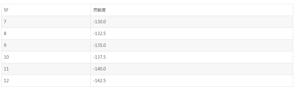 由上表可知扩频因子越大,灵敏度越高,通信距离越远。