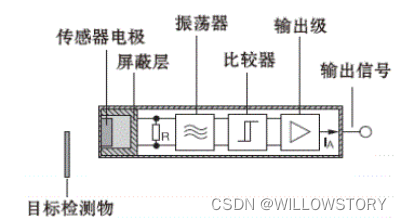 电源接通时,RC振荡器不振荡,当一目标朝着电容器的电靠近时,电容器的容量增加,振荡器开始振荡。通过后级电路的处理,将振荡和不振荡两种信号转换成开关信号,从而起到了检测有无物体存在的目的。该传感器能检测金属物体,也能检测非金属物体,对金属物体可以获得最大的动作距离,对非金属物体动作距离决定于材料的介电常数,材料的介电常数越大,可获得的动作距离越大。