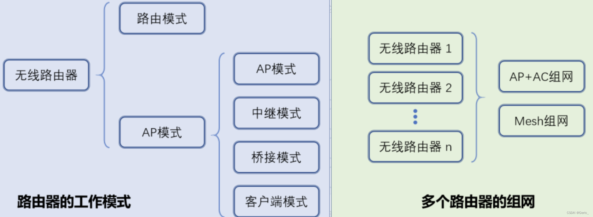 路由器的工作模式众多,大体可分为路由模式和AP模式。AP模式又可细分为AP模式(套娃),中继模式,桥接模式以及客户端模式。基于这些基本的工作模式,多个路由器之间可以形成AP+AC,以及Mesh这两种组网方式,达到无缝覆盖,自动漫游的效果。