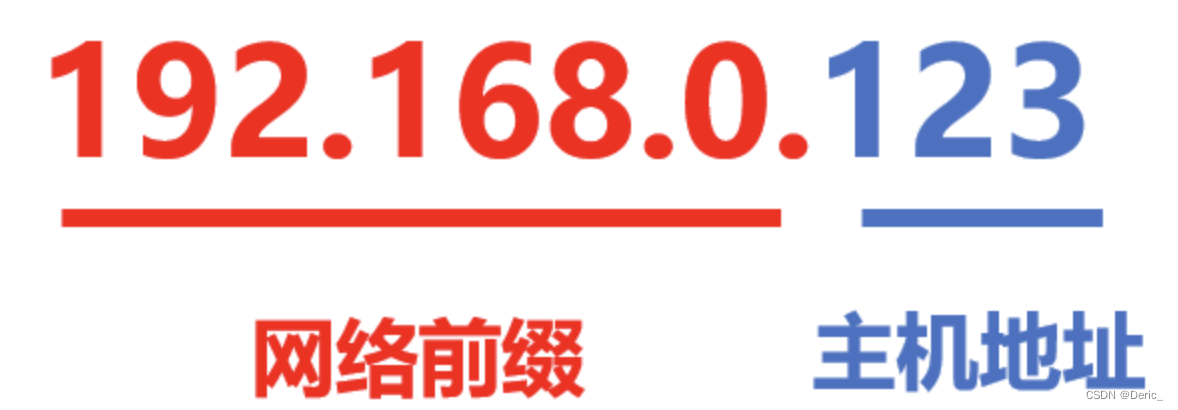 但是,为了方便管理我们还能更加详细的去标识该网络内部的每一台设备。我们将IP地址分成两部分,网络前缀和主机地址。网络前缀标识了一个网络,也称为网段,如下图所示: