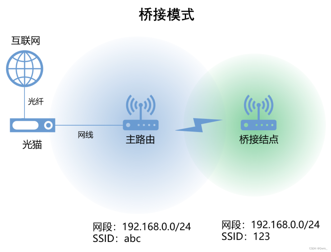 桥接模式和中继模式比较类似,也是在没有网线的情况下,通过无线来连接两个路由器。两者的差异在于:中继模式工作于物理层,不能做任何设置,而桥接模式则工作于数据链路层,可以配置独立的SSID。