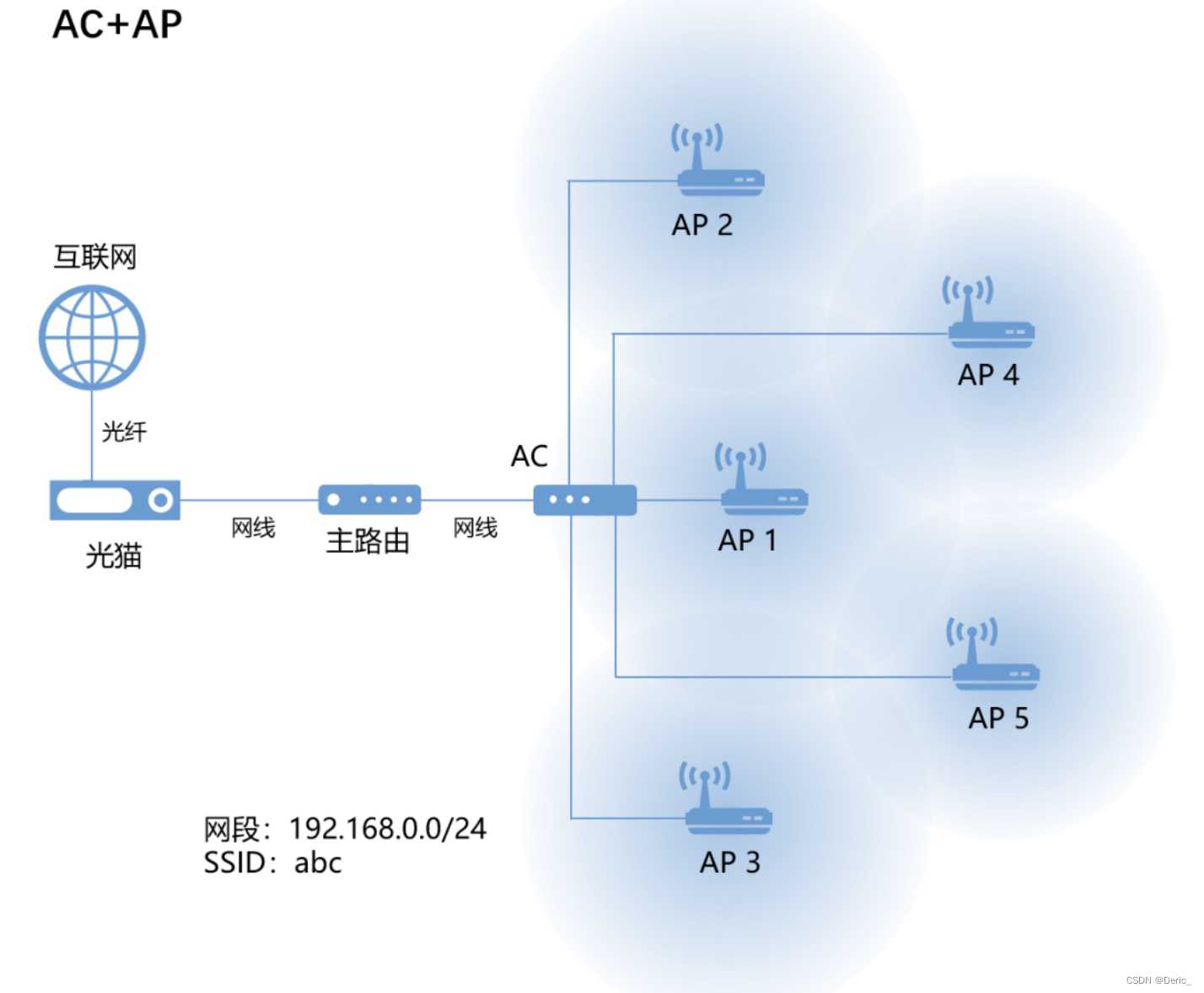 上面这种组网下的AP功能完善,每个节点都要分别配置,相互独立工作,因此叫做“胖AP(Fat AP)”。为了方便管理,我们可以把它进行再拆分,只保留基本的接入功能,将配置管理功能独立出来,组建为一个全新的设备:接入控制器(Access Controller,AC),普遍简称作AC。