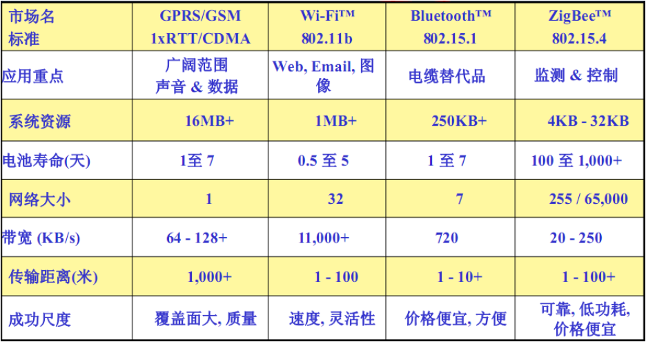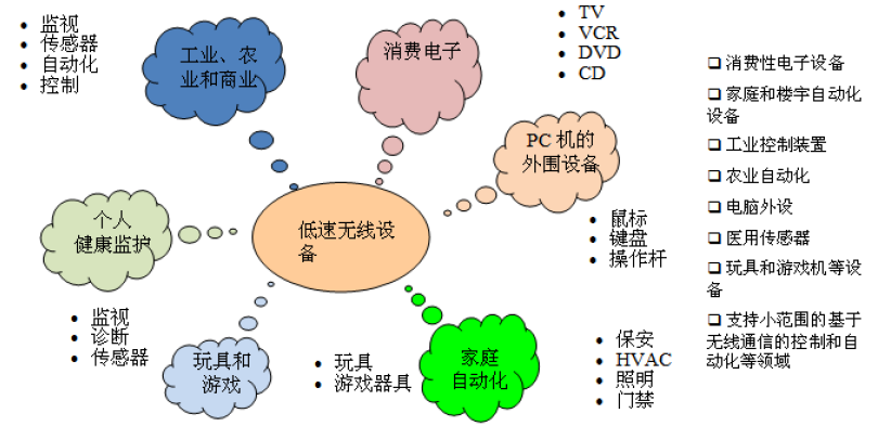 数据传输速率低:10KB/秒~250KB /秒,专注于低传输应用