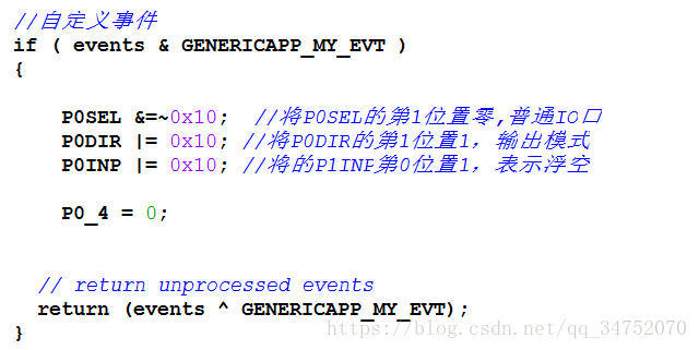 然后在通用应用程序任务事件处理器:UINT16 GenericApp_ProcessEvent( byte task_id, UINT16 events ),这个函数里面处理发生的事件就好了!