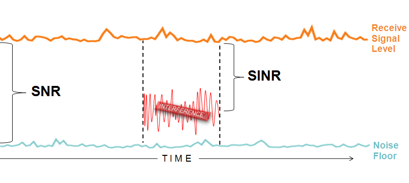 一种预测Wi-Fi系统性能的技术指标就是信噪比(SNR)。SNR是接收信号水平与背景噪音强度的差值。通常,信噪比越高,误码率越低且吞吐量越高。但是,一旦干扰发生,还会有一些其它的问题令网管人员担心,即信号与干扰加噪声比,也称作SINR。