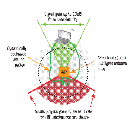 注:图中说明:通过主动避免干扰,可获得额外的信号增益,达-17dB;集成了智能天线阵列的AP;动态优化的天线模式;通过波束成型,信号可增强至10dBi。