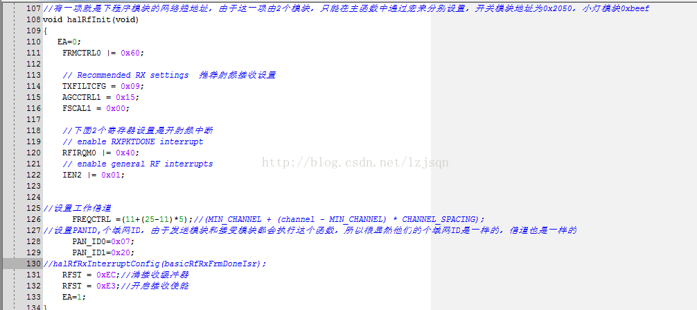 halRfInit();//无线通信的初始化 初始化相关的寄存器,配置工作信道,和PANID