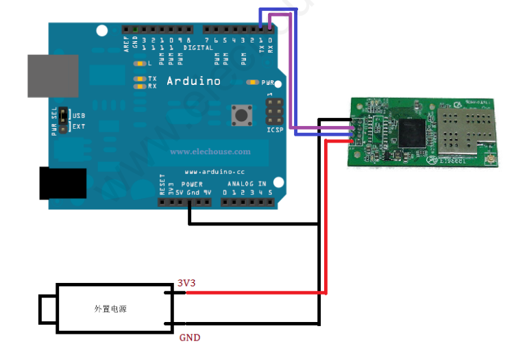 串口/WEB 服务器/ 无线连接3. UART-WIFI模块配置由于 UART-WIFI模块需要3.3V和300mA的输入,而Arduino只能提供3.3V和50 mA,直接连接到Arduino,会导致arduino的3.3v输出,实际测量只有2.3V左右,不能正常使用 UART-WIFI模块。