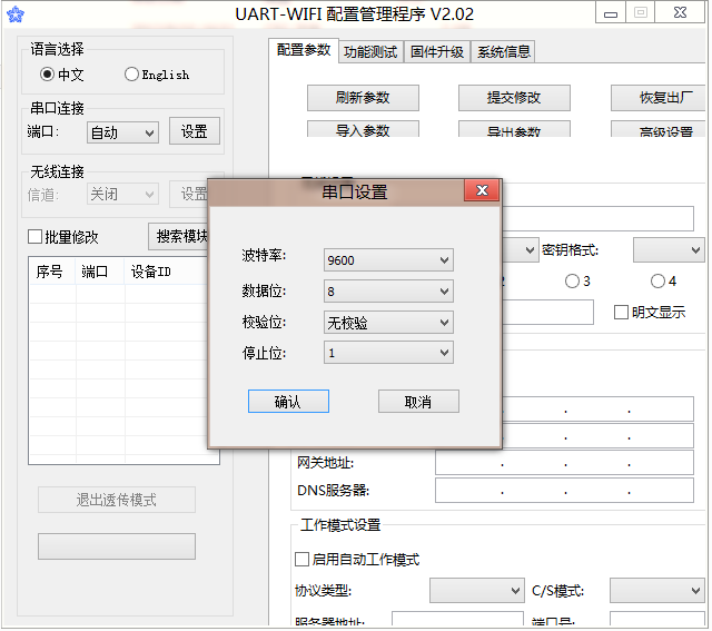 - 启动 UART-WIFI配置管理程序,从端口列表中选择模块的连接端口号,如果不确定可以选择自动(频率设置为9600)