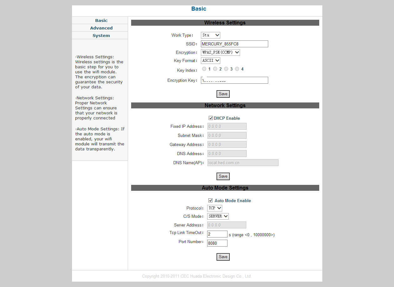 - 网页的配置页面如下图所示,如果要修改无线模块的配置参数,只需在修改完成后点击相应的“ save”按钮即可提交修改