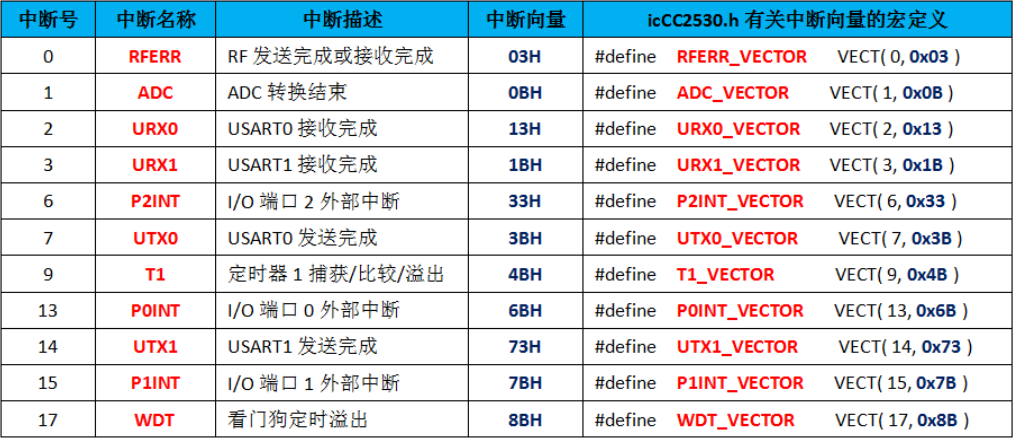 前者是中断向量的入口地址,后者是头文件“ioCC2530.h”中的宏定义。