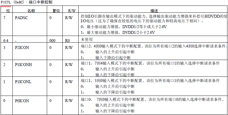 使能中断时候,还需要配置中断方式,这里需要用到PICTRL寄存器(配置中断方式),代码第10行 PICTL |= 0x1;即为将端口0的8个引脚中断模式设置为下降沿触发。