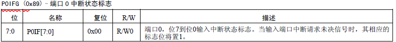 这个标志必须在清除CPU 端口中断标志(PxIF)之前被清除。用于中断的SFR 寄存器描述在下一节。寄存器总结如下:
