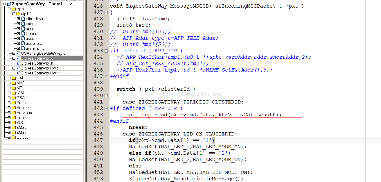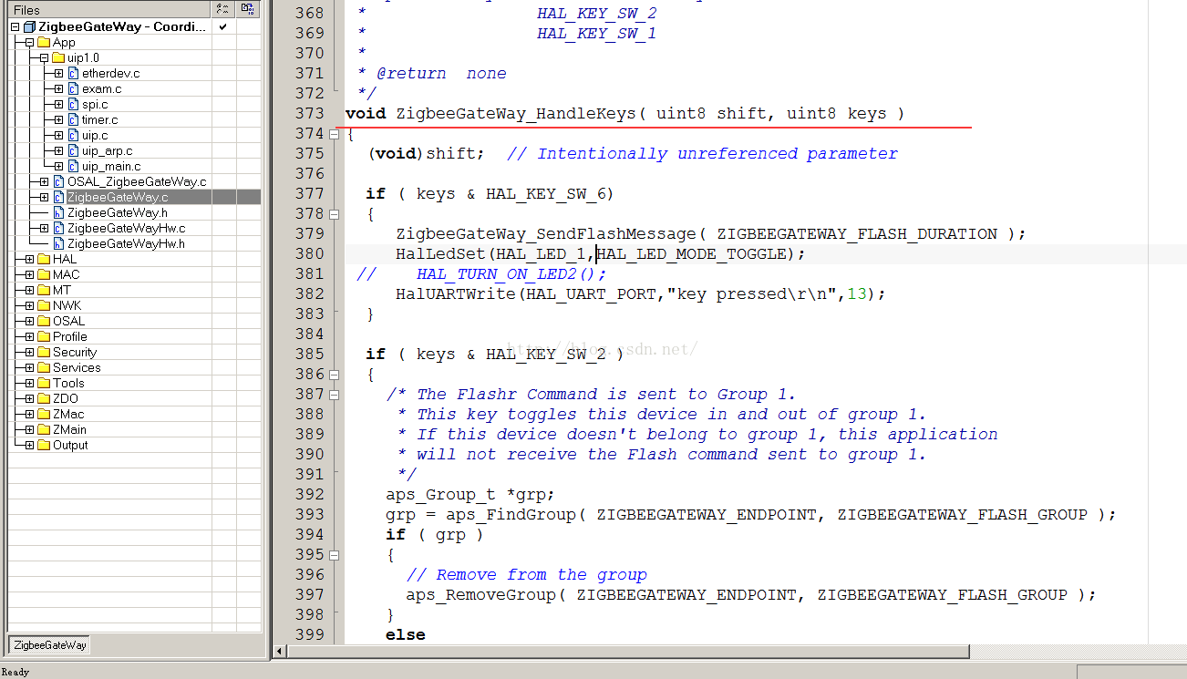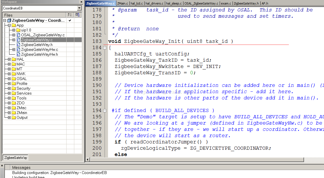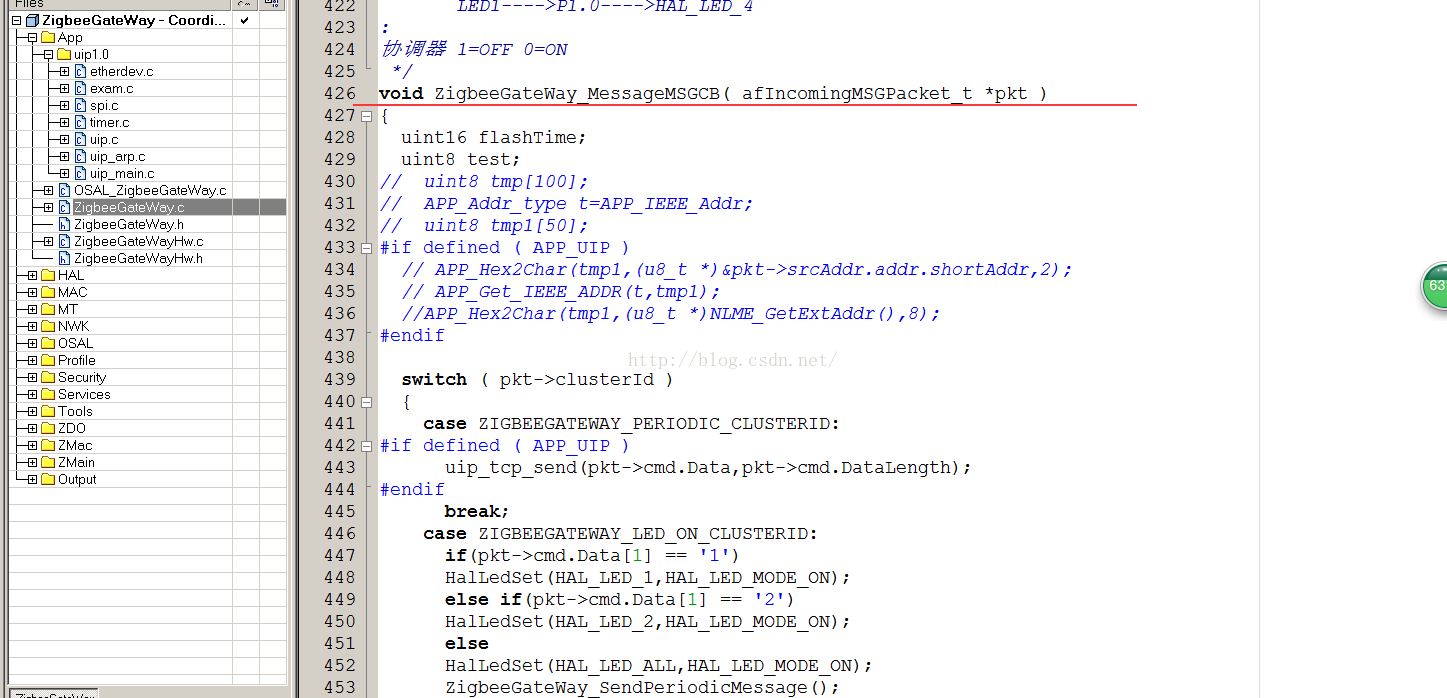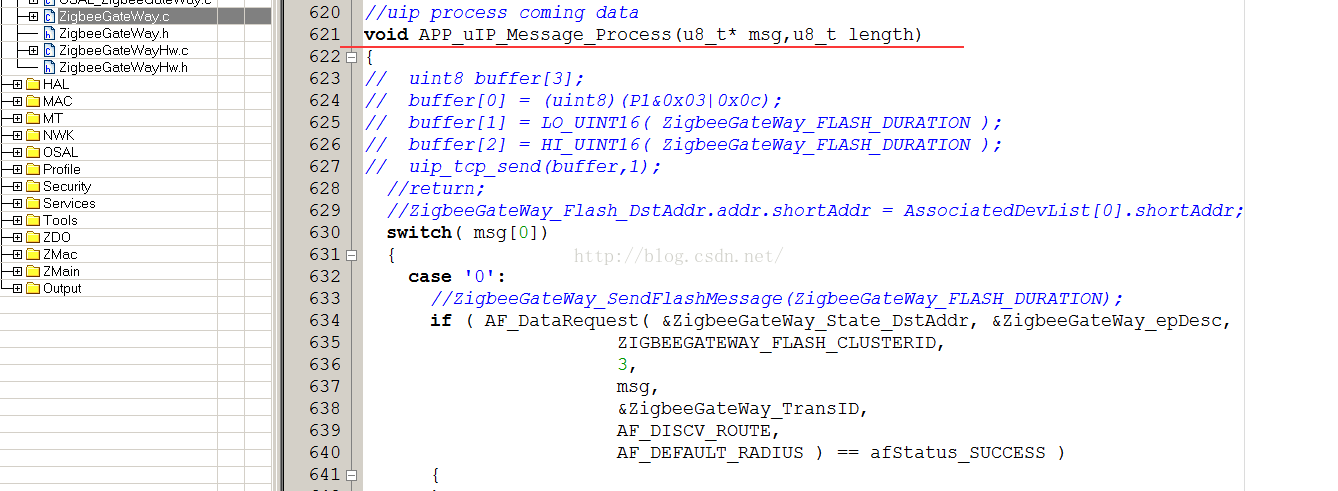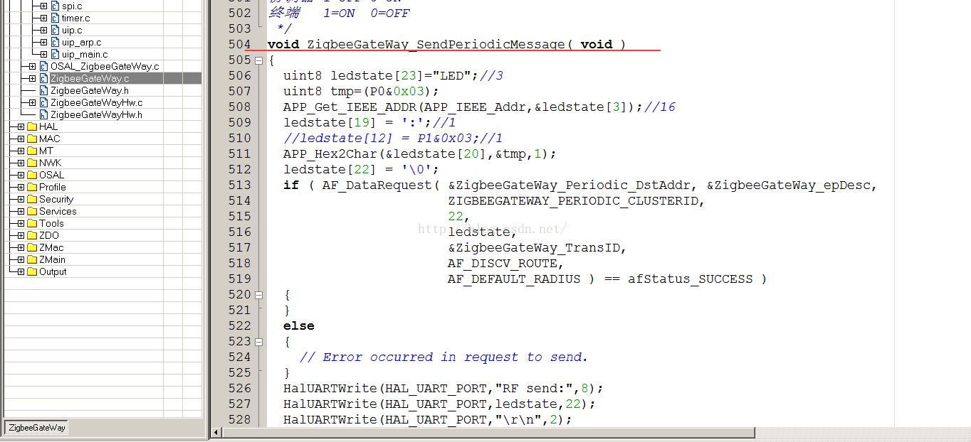 Zstack采用了类似操作系统的概念,有时间片轮训,任务优先级,任务建立等等,对于使用者来讲,不必关心内部怎么运转的,只需要理解几个重要函数即可。注意所有的函数都在App/ZigbeeGateWay.c里面,一般不需要更改其它的文件,用户要更改的所有文件几乎都在App文件夹下面。