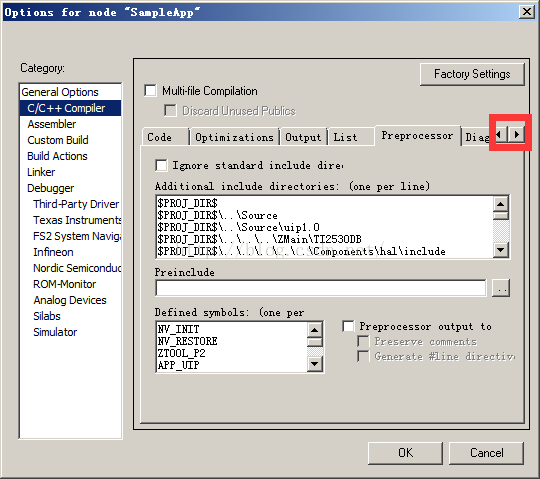 2.找到C/C++ Complier选项卡,通过单击右侧红方框的右箭头找到Preprocessor,在Definedsymbols中就是需要增加的宏,每个宏一行以回车代表当前宏结束,有关ZStack的宏的说明请参考