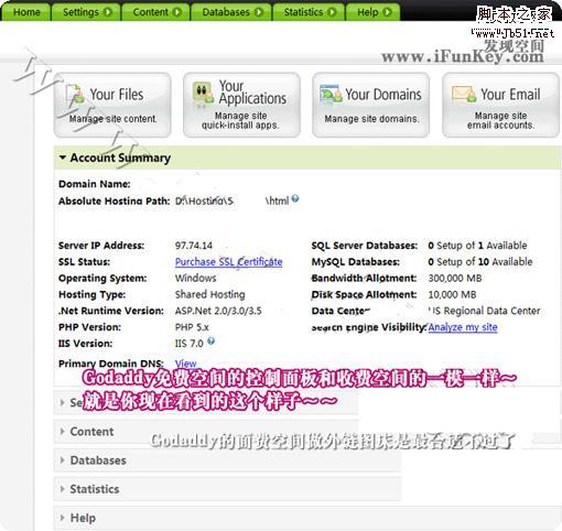 Godaddy提供的免费空间自由度很高,你可以在创建过程中选择使用ASP还是PHP,PHP是4.x还是5.x,以及ASP的IIS版本等等,方便的使用各种网络程序,创建之后觉得不满意,可以取消了重新建立,非常不错~唯一的不足就是免费空间在页面顶部有个巨大的广告,目前有各种方法可以去掉这个广告,但被Godaddy发现的话,直接cancel掉,不能恢复。不过,做站也许不合适,拿来做我们博客或网店的图片外链还是非常不错的,毕竟Godaddy的域名相当实惠~