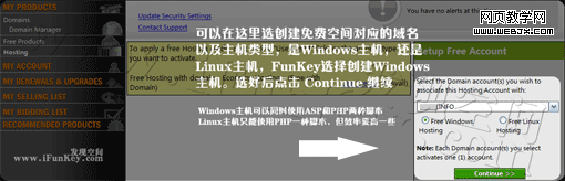 之后点击下图中 Host Account 链接,后面的数字说明的是,你有多少个域名就可以建立多少个免费空间,除了免费空间,还有免费邮箱,相册之类,邮箱可以设置成比如admin@yourname.com之类,还可以转发到自己的常用信箱中,很不错~