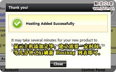 之后如下图所示,账户建立中,点击 Close 按钮,刷新 Hosting 列表,即可看到建立的空间,没有的话耐心等几分钟。