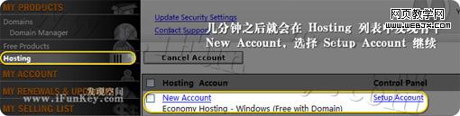 一段短暂的等待之后,如下图,就会在自己的 Hosting 列表中发现有个 New Account ,点击后面的那个 Setup Account 进行空间的详细设置。