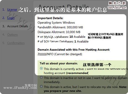 之后跳转到如下页面,显示的无非就是免费空间容量10GB,月流量300GB,可同时建立10个MySQL数据库和一个MSSQL数据库,下面那个 Tell us about your domain 选择第一项,自行设置域名的解析,否则会自动将主域名解析到这个免费空间上。