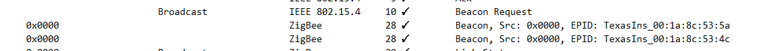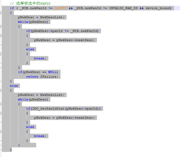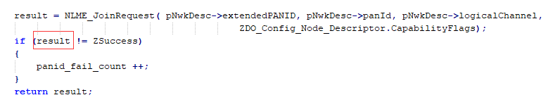 有了一定的规律就通过打印以及抓包分析(个人认为,打印还是最直接有效的定位手段,抓包、仿真、抓波形都是辅助手段),发现到一点,以前关联设备都是先NLME_NetworkDiscoveryRequest,收到beacon帧回应后,在ZDO_NetworkDiscoveryConfirmCB里面,判断哪些网络可以加入(全局变量NwkDescList的链表里就是所有网关回应beacon帧的消息信息),问题就在这里,之前公司的代码是每次先连接NwkDescList链表里第一个网关,如果失败,就接着下一个连接,但是连接成功判断条件却是NLME_JoinRequest函数的返回值,因为这个操作是异步的,也就是这个函数结果基本上一直都是0,就会导致,每次扫描后,总是连接第一个返回beacon帧的网关,导致概率性的绑定不上,以及绑定慢,网关越多,绑定的越慢,绑定不上的概率越大。