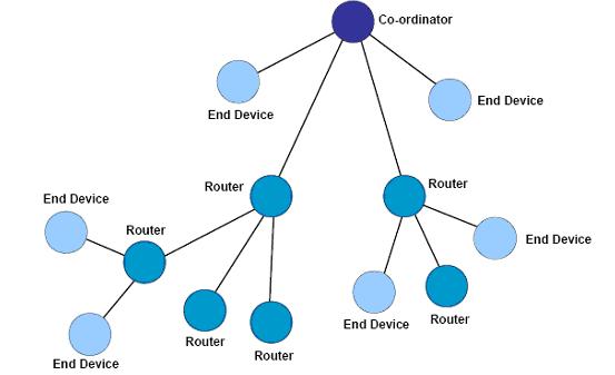 这种拓扑形式的缺点是节点之间的数据路由只有唯一的一个路径。Co-ordinator(协调者)有可能成为整个网络的瓶颈。实现星形网络拓扑不需要使用 ZigBee 的网络层协议,因为本身IEEE 802.15.4的协议层就已经实现了星形拓扑形式,但是这需要开发者在应用层作更多的工作,包括自己处理信息的转发。