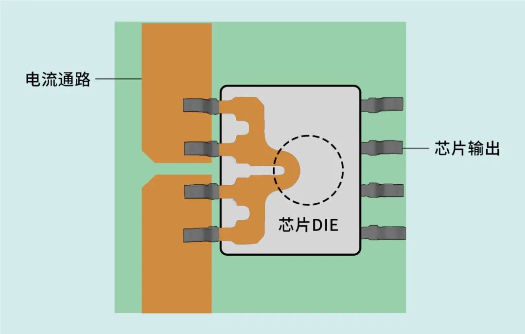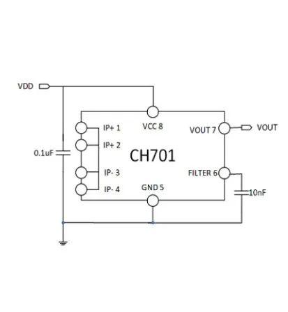 CH701芯片完全是基于霍尔感应原理设计,由一个精确的低偏移线性霍尔传感器电路与位于接近芯片表面的铜箔组成,当电流流过铜箔时,产生一个磁场,霍尔元件根据磁场强度感应出一个线性的电压信号,经过内部的放大、滤波、斩波与修正电路,输出一个电压信号,由该芯片的7号管脚输出,直接反应出流经铜箔电流的大小。因为斩波电路的原因,其输出将加载于0 .5*Vcc上,其输出与输入的关系为Vout=0 .5*Vcc+Ip*Sensitivity。