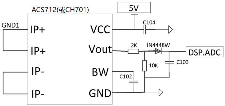 霍尔电流传感器IC通过霍尔效应,检测电流的大小,输出一个以2 .5V为基准的电压值,Vout的电压值通过高精度电阻分压。经过二极管后,进入到主控芯片DSP的AD采集引脚进行AD转换,二极管起到保护作用。