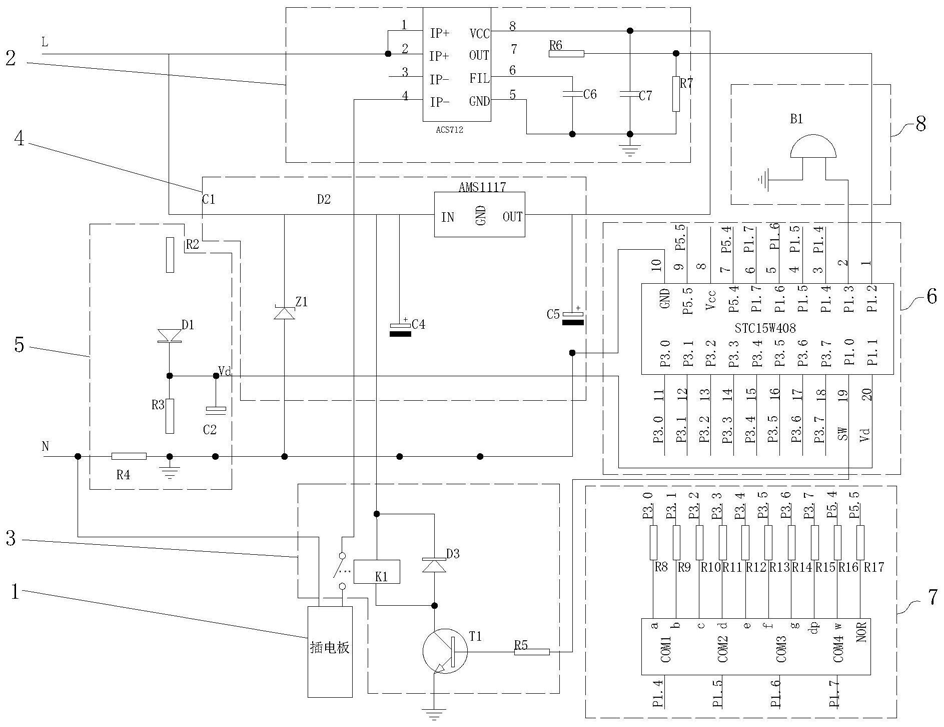 电流检测电路包括ACS712(或CH701)芯片,芯片的IP-引脚接入继电器电路,VCC引脚一方面经电容C7后接地,另一方面接入主控电路的电源端,OUT引脚一方面经电阻R6、电阻R7后接地,FIL引脚经电容C6接地,电阻R6和电阻R7的公共端接入主控电路。