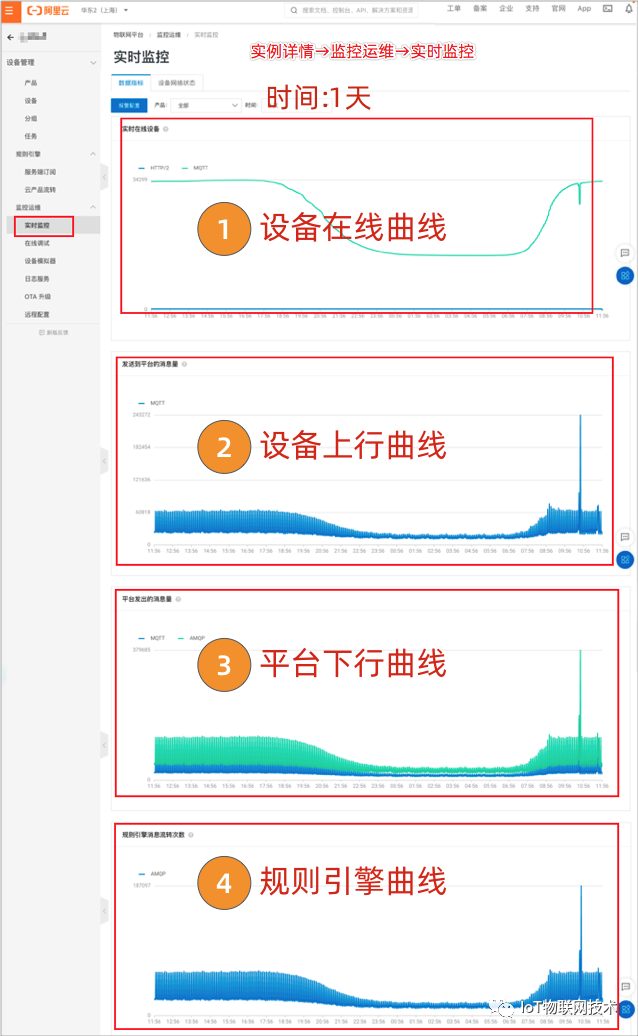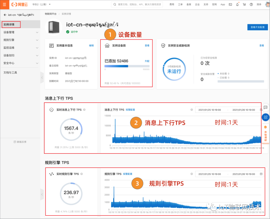 当我们完成 IoT 物联网业务开发,设备上线运行过程中,可以登录IoT控制台,在实例详情页面,查看实际运行情况。如下图: