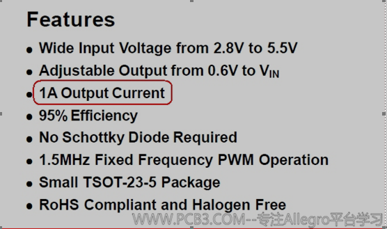 注意其中关于输出电流值的说明,这里最大输出电流为1A,设计的时候过孔的数目是根据电流大小来决定的。