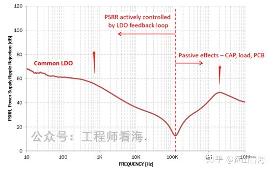 LDO重要参数之一也是巨大优点之一便是纹波小,即PSRR好,PSRR是电源抑制比,是LDO对输入电源纹波的抑制程度,PSRR的绝对值越大越好。看PSRR曲线有个转折点,左边为LDO自身起主导作用,右边为输出电容起主导作用,PSRR性能好的LDO左边的曲线会更高,加大输出电容,右边的曲线会升高。