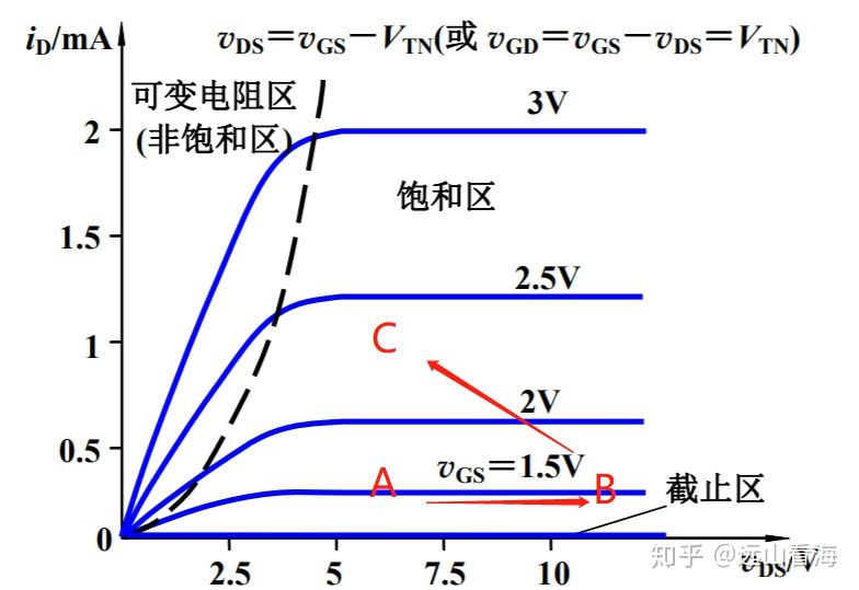 下图是某NMOS输出特性曲线,让我们结合上图和下图分析,当Vout下降,Vin不变,则Vds=Vin-Vout,Vds增加,MOS工作点由A转移到B;紧接着反馈回路开始工作,Vfb电压减小,经过误差放大器后,Vg增加,那么Vgs=Vg-Vs,Vgs也增加,从下图可以看到,随着Vgs增加,MOS的电流Id逐渐上升,进而使得Vout逐渐升高,Vds减小,LDO又回到指点工作点。