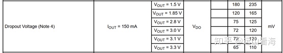 上文分析了PMOS LDO工作在恒流区(饱和区),DS之间有一定的压差,此压差常称为dropout voltage(Vdo),所以LDO若想稳定工作在饱和区,输入输出之间满足一定的压差,应用中通常可以考虑在spec中预留25%的余量。比如下图中在Iout=150mA时,不同Vout对应的Vdo也不同。有的厂家称Head room为Dropout Voltage,这是更严格的一个参数,除了保证LDO稳定性外,还保证了LDO的其他性能。