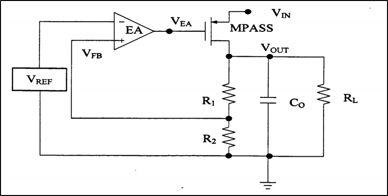 误差放大器(EA),调整管(MPASS),反馈电阻(Rl,R2)四个模块,如下图所示。其中: