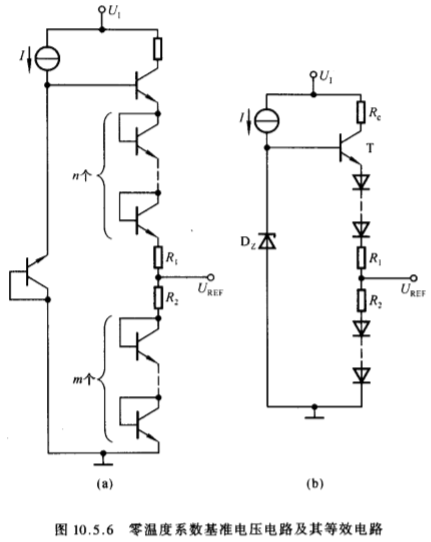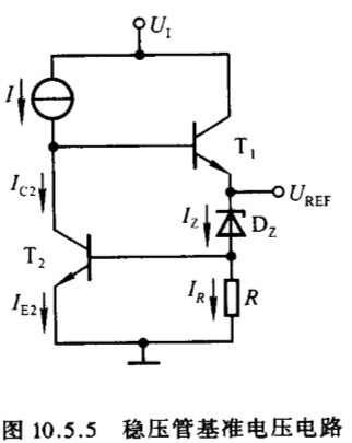 (1)、基准电压电路:串联型稳压电路输出电压的稳定性取决于基准电压的稳定性,因而通常要求基准电压电路具有温度系数为零、输出阻抗小、噪声低的特点。如下图所示,稳压管具有正温度系数,T2三极管具有负温度系数,因此该电路具有温度补偿作用,当温度发生变化时,与