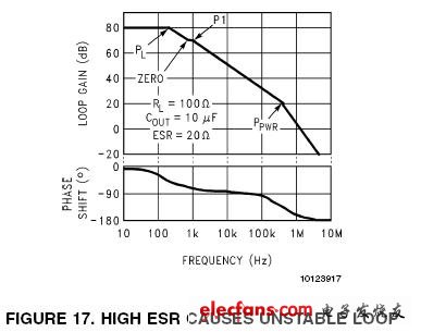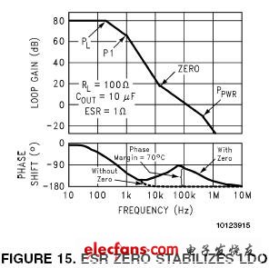 要弄清ESR取之范围上限下降的原因,请参考图15。上文提到,此LDO的零点已被集成在IC内部。因此外部电容产生的零点必须处在足够高的频率,这样就不能使带宽很宽。否则,高频极点会产生很大的相移从而导致振荡。