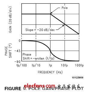 极点(Pole)定义为增益曲线(Gain curve)中斜度(Slope)为-20dB/十倍频程的点(图9:波特图中的极点)。每添加一个极点,斜度增加20dB/十倍频程。增加n个极点,n ×(-20dB/十倍频程)。每个极点表示的相位偏移都与频率相关,相移从0到-90°(增加极点就增加相移)。最重要的一点是几乎所有由极点(或零点)引起的相移都是在十倍频程范围内。